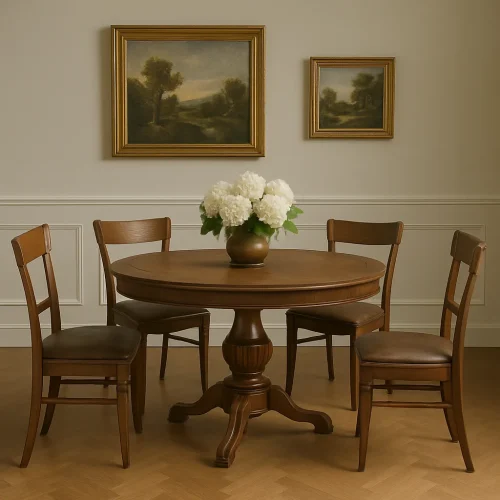 Our solid wood dining tables are built for everyday meals and memorable gatherings. Whether you need a compact round table or a large extendable piece, each design offers durability and timeless beauty.