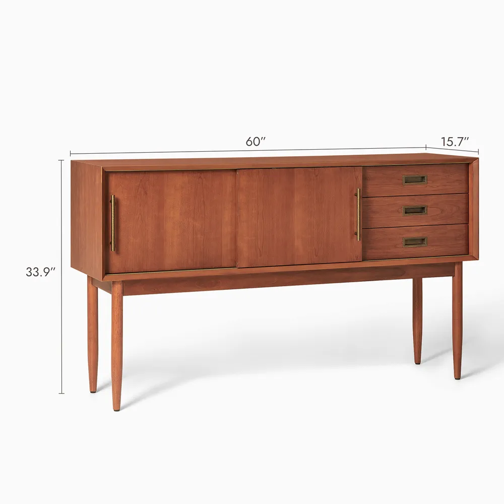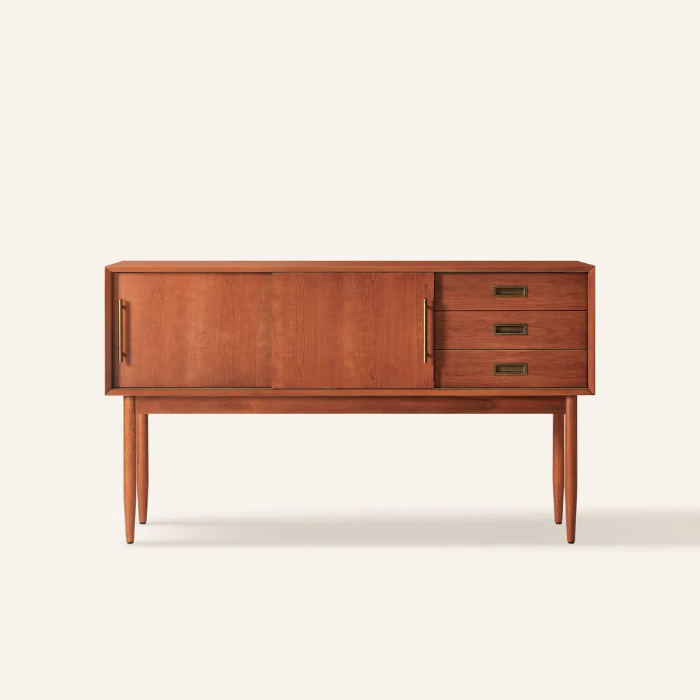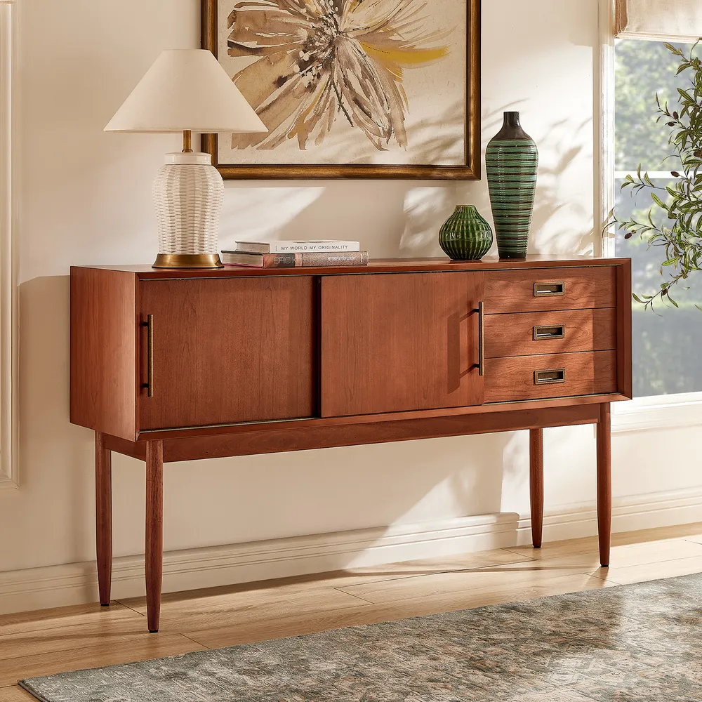 A mid-century accent featuring clean lines, classy tapered wood legs, and a warm, nostalgic tone that blends effortlessly across time and styles. The lifted space beneath, beveled front edges, and moderate profile work together to create a sturdy yet not chunky look, making this sideboard a humble and natural addition to any room.