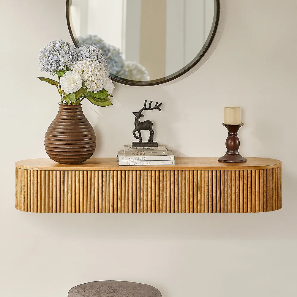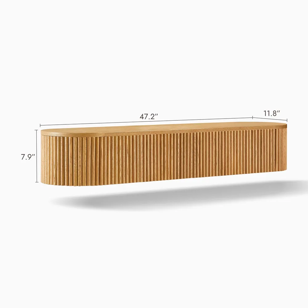Solid oak fluting presents natural texture.