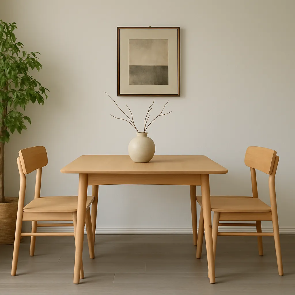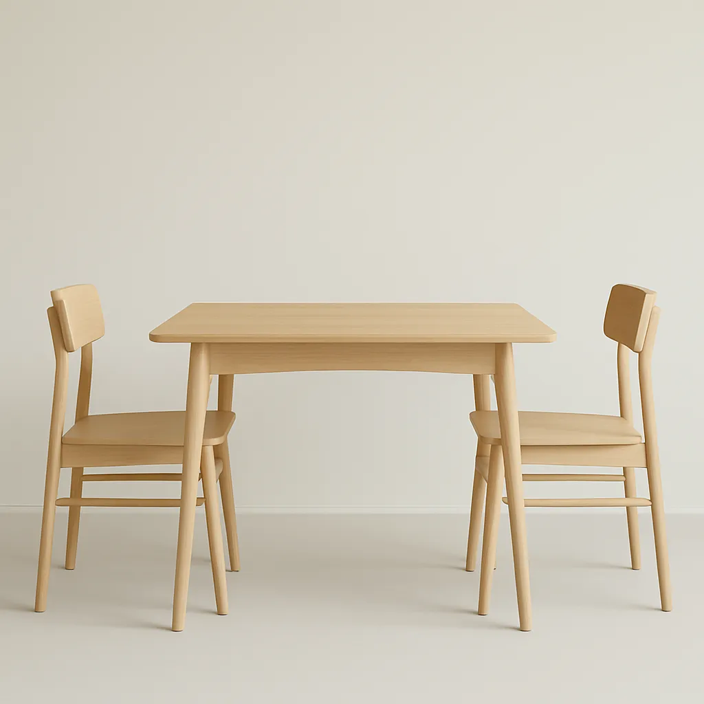 Minimalist dining table with tapered leg and flat top, fits small space with neutral tone and simple form.