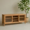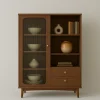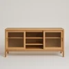 Create a tidy and open feel in the kitchen or dining space with this sliding door cabinet designed with a simple, modern frame. The structure includes two fluted glass doors that slide to reveal an adjustable shelf for plate, glass or pantry item. A central open compartment allows quick placement of a frequently used object or a decorative touch. The low design and clear lines bring a sense of order while supporting daily storage needs. Suitable for an open kitchen, compact interior or relaxed dining area, this cabinet blends function with understated form.